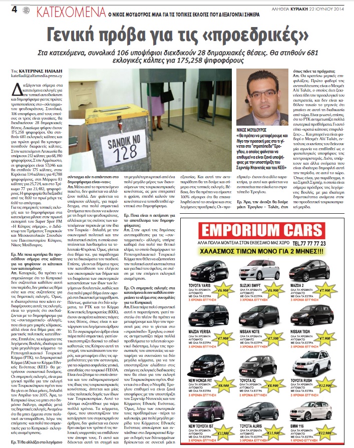 Για τις σημερινές τοπικές εκλογές και το δημοψήφισμα στα κατεχόμενα μίλησε στην πρωινή εκπομπή του Super Spor FM «Η Κύπρος σήμερα», ο Διδάκτωρ του Τμήματος Τουρκικών και Μεσανατολικών Σπουδών του Πανεπιστημίου Κύπρου, Νίκος Μούδουρος.
