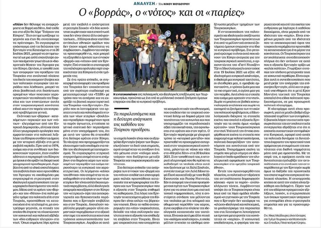 «Πλέον δεν θέλουμε να αναφερόμαστε σε Βορρά και Νότο. Από τούδε και στο εξής θα λέμε ‘Τούρκοι της Κύπρου’. Έτσι αντιμετωπίζουμε το γεγονός και έτσι θα συνεχίσουμε να πράττουμε». Το συγκεκριμένο απόσπασμα από τις δηλώσεις του Ερντογάν στα Κατεχόμενα στις 20 Ιουλίου 2021, μπορεί να αντιμετωπιστεί ως μια απλή επανάληψη αυτών που έμειναν γνωστές ως οι «διαχρονικές θέσεις» της Άγκυρας για την Κύπρο. Ωστόσο, η τοποθέτηση των αναφορών του προέδρου της Τουρκίας στο αναλυτικό πλαίσιο της δικής του κοσμοαντίληψης και των πολιτικών συγκυριών της περιόδου που λέχθηκαν, μπορεί να είναι βοηθητική στη διαπίστωση ορισμένων νέων ποιοτικών χαρακτηριστικών της πολιτικής της Τουρκίας και των επιπτώσεων αυτής στην τουρκοκυπριακή κοινότητα ειδικά και στην πορεία του κυπριακού προβλήματος γενικά.