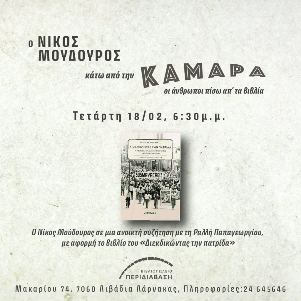 Με αφορμή την εκδήλωση για το βιβλίο «Διεκδικώντας την πατρίδα» από το βιβλιοπωλείο Περιδιάβαση, ο Νίκος Μούδουρος συνομίλησε με τη δημοσιογράφο Κατερίνα Ηλιάδη στην εκπομπή Πρωινή Επιθεώρηση στις 17/2/2026 για τα πρόσφατα γεγονότα στην Τουρκοκυπριακή κοινότητα.