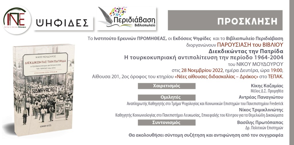 Το Τμήμα Τουρκικών και Μεσανατολικών Σπουδών του Πανεπιστημίου Κύπρου και οι Εκδόσεις Ψηφίδες, σας προσκαλούν στην παρουσίαση του βιβλίου «Διεκδικώντας την Πατρίδα. Η τουρκοκυπριακή αντιπολίτευση την περίοδο 1964-2004», του Νίκου Μούδουρου.