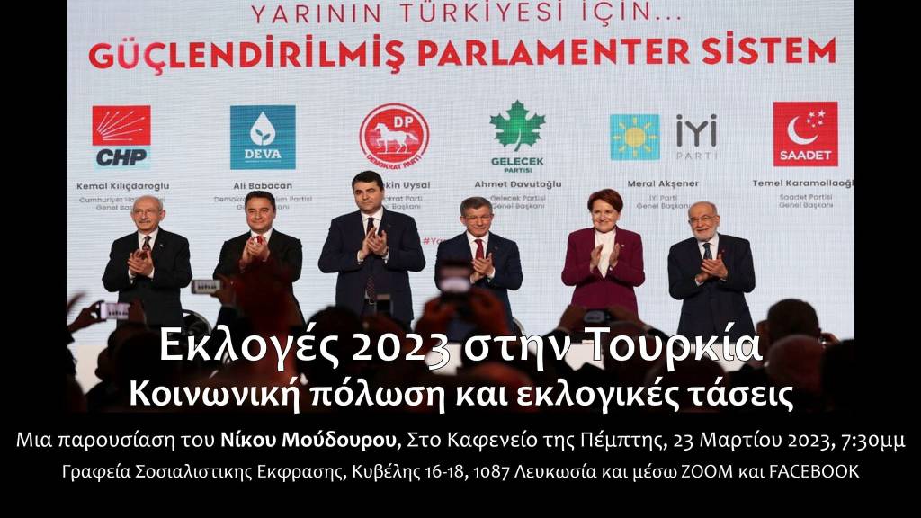 Η παρουσίαση αυτή θα ασχοληθεί με την περιγραφή των κυριότερων πολιτικών συμμαχιών που έχουν σχηματιστεί στην Τουρκία πριν από τις προεδρικές και βουλευτικές εκλογές του 2023. Τα κόμματα και τα ιδεολογικά τους προγράμματα, οι υποψηφιότητες για την προεδρία της χώρας, καθώς και ο ιστορικός συμβολισμός των 100 χρόνων από την ίδρυση του τουρκικού κράτους, είναι μεταξύ των βασικών στοιχείων της προεκλογικής περιόδου. Ωστόσο είναι γεγονός ότι όλα τα προαναφερθέντα στοιχεία λειτουργούν, επηρεάζονται από και επηρεάζουν ένα συγκεκριμένο κοινωνικοοικονομικό πλαίσιο μέσα στο οποίο εμφανίζονται. Συνεπώς η πληρέστερη κατανόηση της πολιτικής αντιπαράθεσης των εκλογών στην Τουρκία, απαιτεί μια ευρύτερη ανάλυση των κύριων διαιρετικών αξόνων της κοινωνίας και των εκφράσεων τους στο πολιτικό και εκλογικό επίπεδο. Μέσα σε αυτό το πλαίσιο η παρουσίαση θα επεκταθεί στην παρουσίαση των κοινωνικών, οικονομικών και πολιτισμικών αντιπαραθέσεων που εκπροσωπούν οι διαφορετικές συμμαχίες στις εκλογές της Τουρκίας.