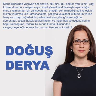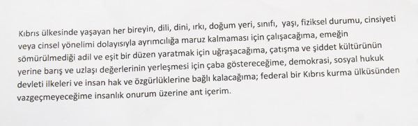 «Ορκίζομαι στην ανθρώπινη μου τιμή ότι θα εργαστώ για τον οποιοδήποτε ζει στην Κύπρο με στόχο να μη θυματοποιηθεί εξαιτίας της γλώσσας, της θρησκείας, της φυλής, του τόπου γέννησης, της κοινωνικής τάξης, της ηλικίας, της φυσικής ικανότητας, του φύλου ή του σεξουαλικού προσανατολισμού, ότι θα προσπαθήσω για τη δημιουργία ενός περιβάλλοντος δικαιοσύνης και ισότητας όπου η εργασία δε θα γίνεται αντικείμενο εκμετάλλευσης, ότι θα επιδιώξω την αντικατάσταση της κουλτούρας της σύγκρουσης και της βίας με τη θεμελίωση των αξιών της ειρήνης και της συναίνεσης, ότι θα μείνω αφοσιωμένη στις αξίες του κράτους δικαίου και των ανθρωπίνων δικαιωμάτων και ελευθεριών, ότι δε θα παραιτηθώ από το όραμα της εγκαθίδρυσης μιας ομοσπονδιακής Κύπρου»[2].