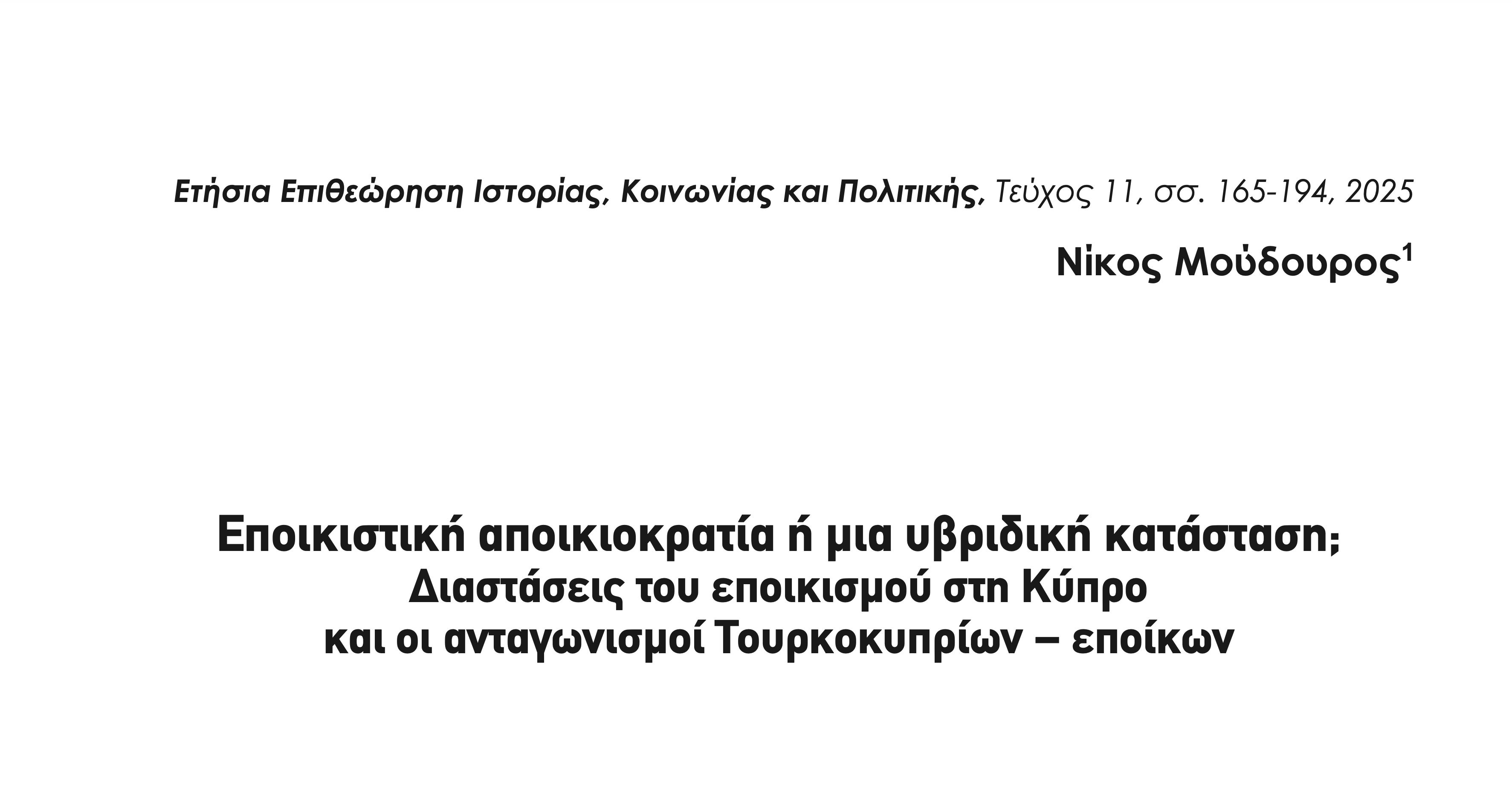 Δεν είναι καθόλου εύκολο να μιλήσει κάποιος για το φαινόμενο της εποικιστικής αποικιοκρατίας αναφερόμενος σε σχετικά πρόσφατα γεγονότα. Το φαινόμενο της εποικιστικής αποικιοκρατίας, αλλά και γενικότερα η αποικιοκρατία υποτίθεται ότι έληξαν στα μέσα του 20ου αιώνα, δηλαδή σε μια στιγμή που ολοκληρώνεται και η διαδικασία της αποαποικιοποίησης. Με λίγα λόγια, η εποικιστική αποικιοκρατία θεωρήθηκε ως ένα κεφάλαιο της παγκόσμιας ιστορίας που έχει κλείσει. Το συγκεκριμένο κείμενο επιδιώκει να αναλύσει κάποιες πτυχές του εποικισμού της Κύπρου μετά το 1974 μέσα από την αξιοποίηση του θεωρητικού πλαισίου της εποικιστικής αποικιοκρατίας. Δε μπορεί φυσικά να θεωρηθεί μια ολοκληρωμένη προσπάθεια, αλλά μια πρώτη «δοκιμή» εμπλουτισμού τόσο του θεωρητικού πλαισίου, όσο και της κυπριακής περίπτωσης. Το κείμενο βασίζεται σε μια παρουσίαση που έγινε στο Επιστημονικό Συνέδριο «50 Χρόνια από το πραξικόπημα και την τουρκική εισβολή στην Κύπρο», το οποίο διοργάνωσε το Ινστιτούτο Ερευνών Προμηθέας στις 28-29 Ιουνίου 2024, στο Πανεπιστήμιο Κύπρου.