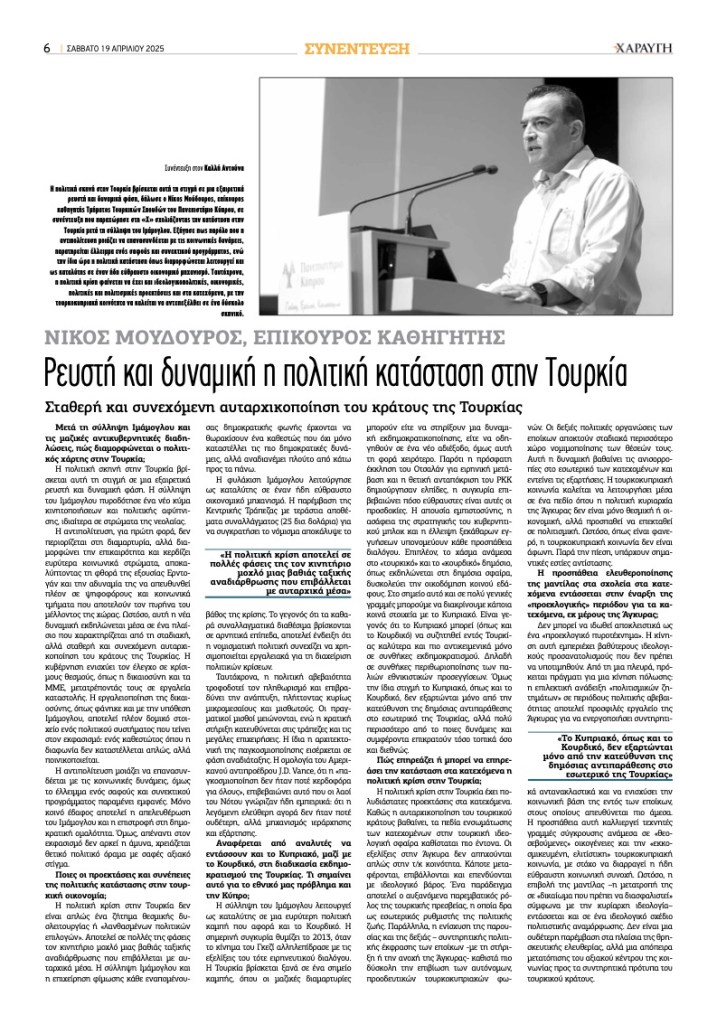 Η πολιτική σκηνή στην Τουρκία βρίσκεται αυτή τη στιγμή σε μια εξαιρετικά ρευστή και δυναμική φάση, δήλωσε ο Νίκος Μούδουρος, επίκουρος καθηγητής Τμήματος Τουρκικών Σπουδών του Πανεπιστήμιο Κύπρου, σε συνέντευξη που παραχώρησε στη «Χ» σχολιάζοντας την κατάσταση στην Τουρκία μετά τη σύλληψη του Ιμάμογλου.