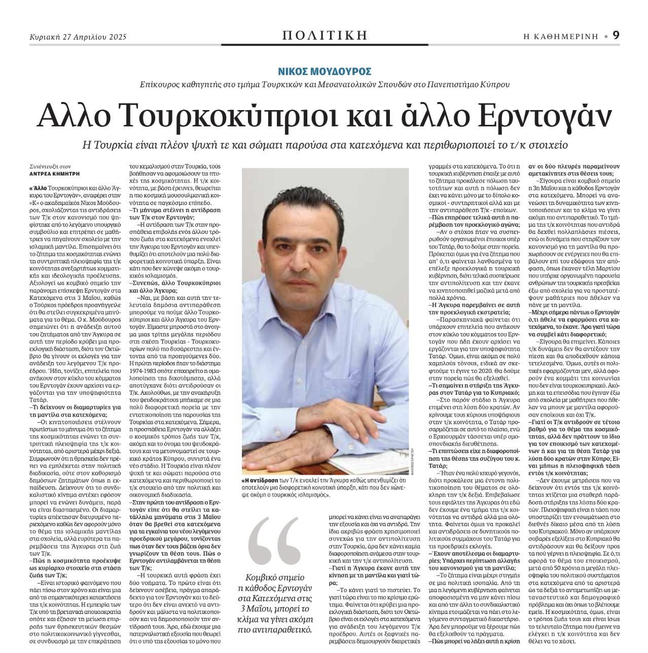 «Άλλο Τουρκοκύπριοι και άλλο Άγκυρα του Ερντογάν», αναφέρει στην «Κ» ο ακαδημαϊκός Νίκος Μούδουρος, σχολιάζοντας τις αντιδράσεις των Τ/κ στον κανονισμό που ψηφίστηκε από το λεγόμενο υπουργικό συμβούλιο και επιτρέπει σε μαθήτριες να πηγαίνουν σχολείο με την ισλαμική μαντίλα. Επισημαίνει ότι το ζήτημα της κοσμικότητας ενώνει τη συντριπτική πλειοψηφία της τ/κ κοινότητας ανεξαρτήτως κομματικής και ιδεολογικής προέλευσης. Αξιολογεί ως κομβικό σημείο την παράνομη επίσκεψη Ερντογάν στα Κατεχόμενα στις 3 Μαΐου, καθώς ο Τούρκος πρόεδρος προανήγγειλε ότι θα στείλει συγκεκριμένα μηνύματα για το θέμα. Ο κ. Μούδουρος σημειώνει ότι η ανάδειξη αυτού του ζητήματος από την Άγκυρα σε αυτή την περίοδο κρύβει μια προεκλογική διάσταση, διότι τον Οκτώβριο θα γίνουν οι εκλογές για την ανάδειξη του λεγόμενου Τ/κ προέδρου. Ήδη, τονίζει, επιτελεία που ανήκουν στον κύκλο του κόμματος του Ερντογάν έχουν αρχίσει να εργάζονται για την υποψηφιότητα Τατάρ.